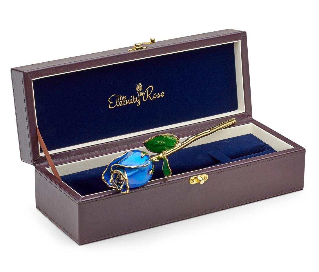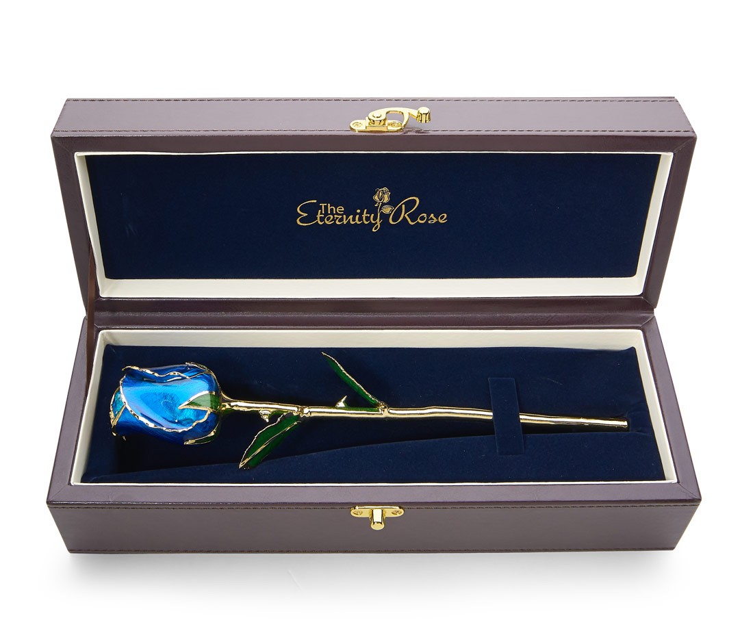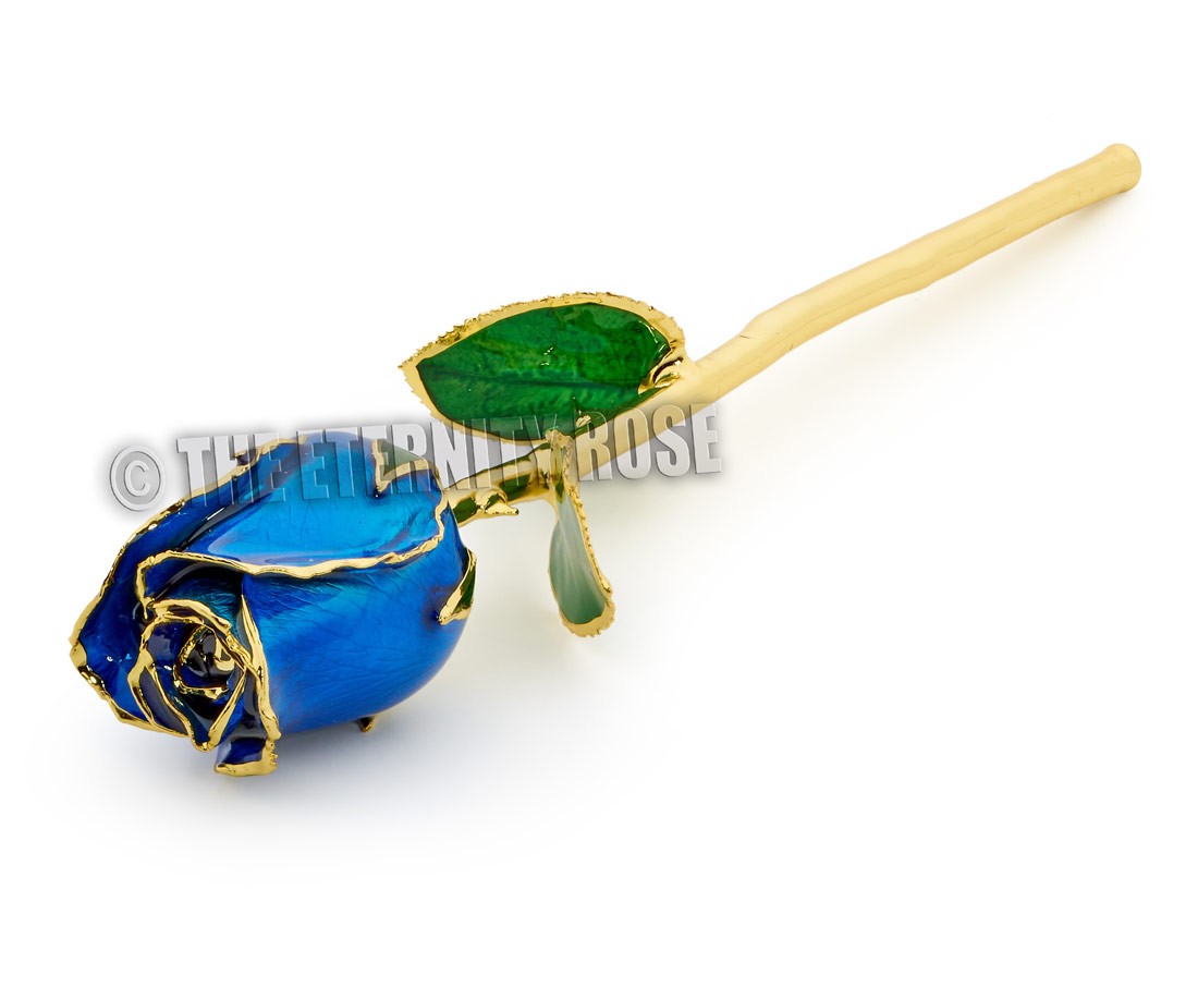 As part of our Eternity Rose collection, we present this gorgeous work of art which has been created by electroplating a natural blue rose with 24 karat gold, and then covering the leaves and petals in a permanent and radiant glaze.
