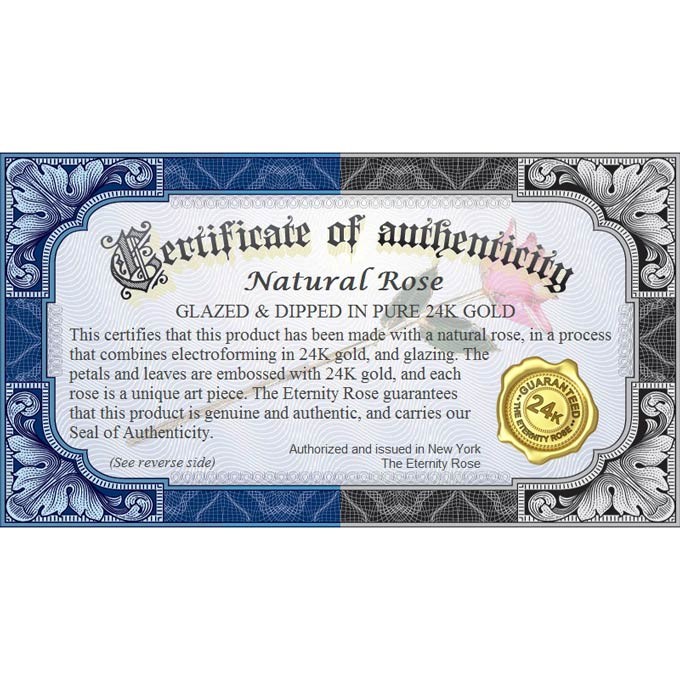 Each rose is crafted by hand and is truly unique, featuring 24 karat gold embossed on its petals, stem and leaf edges. The rose is accompanied by a certificate of authenticity, verifying that each item is an individually designed and genuine piece of art, coated in genuine 24k gold.