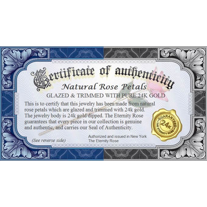 - A stylish pendant formed from real natural red rose petals that have been glazed and decorated with a trim of pure 24 karat gold. Featuring a 3/4" diameter miniature rose head, the pendant is 1 1/2" high overall and has a width of 1.1". The rose pendant is complemented by two leaf figurines, encrusted with 30 synthetic diamonds and dipped in 24 karat gold.