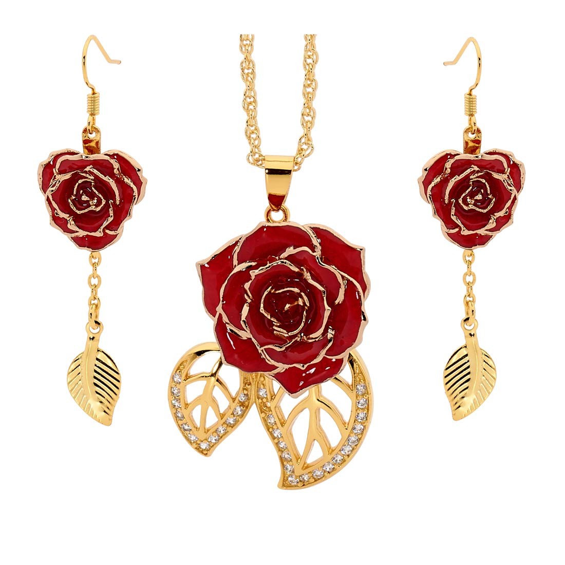 This magnificent 24k gold-trimmed glazed rose and leaf-themed jewelry set includes: